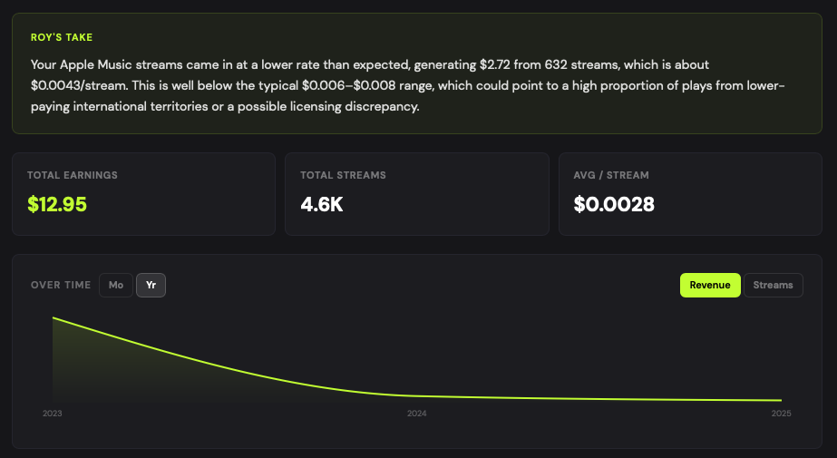 Drop in any royalty statement — from Spotify, ASCAP, DistroKid, the MLC, or anywhere else — and Roy reads it, explains it in plain English, and tells you exactly what's missing or wrong.